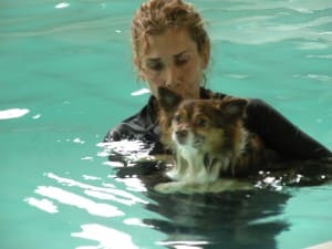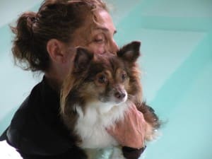 Even though we’re still under construction, we put our first dog in the pool yesterday! TVS (Television Syndication Station) interviewed us for a segment of their Real Life 101 nationally syndicated television show. It’s a show aimed at young adults and introduces them to “real people doing real jobs.” They contacted us several months ago after learning about us via our website. So I was the one who spoke on camera while Toby got in the pool with our wonderful demo dog, Aldo Marmarchev, a 5 year old long hair chihuahua. Aldo’s dad, Steve, graciously allowed Aldo to participate. It was very exciting but more exciting to know that we’re almost ready to open. It seems all the more real when we can actually get in the pool!